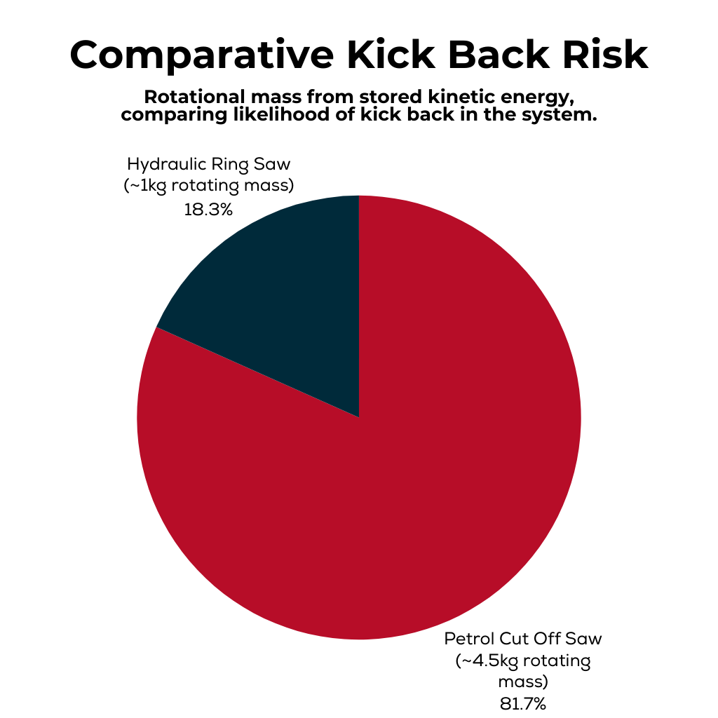 From a mechanical safety perspective, one of the most significant differentiators between hydraulic ring saws and petrol cut-off saws lies in blade mass and rotational inertia. A 16-inch ring saw blade with 300mm cutting depth weighs approximately 1kg. By comparison, a 20-inch petrol cut-off disc delivering only 212mm cutting depth can weigh approximately 4.5kg. The stored rotational energy in a rotating system is directly proportional to its mass and square of its velocity. Reduced blade mass and lower operating RPM in the hydraulic ring saw significantly decrease kinetic energy within the system.