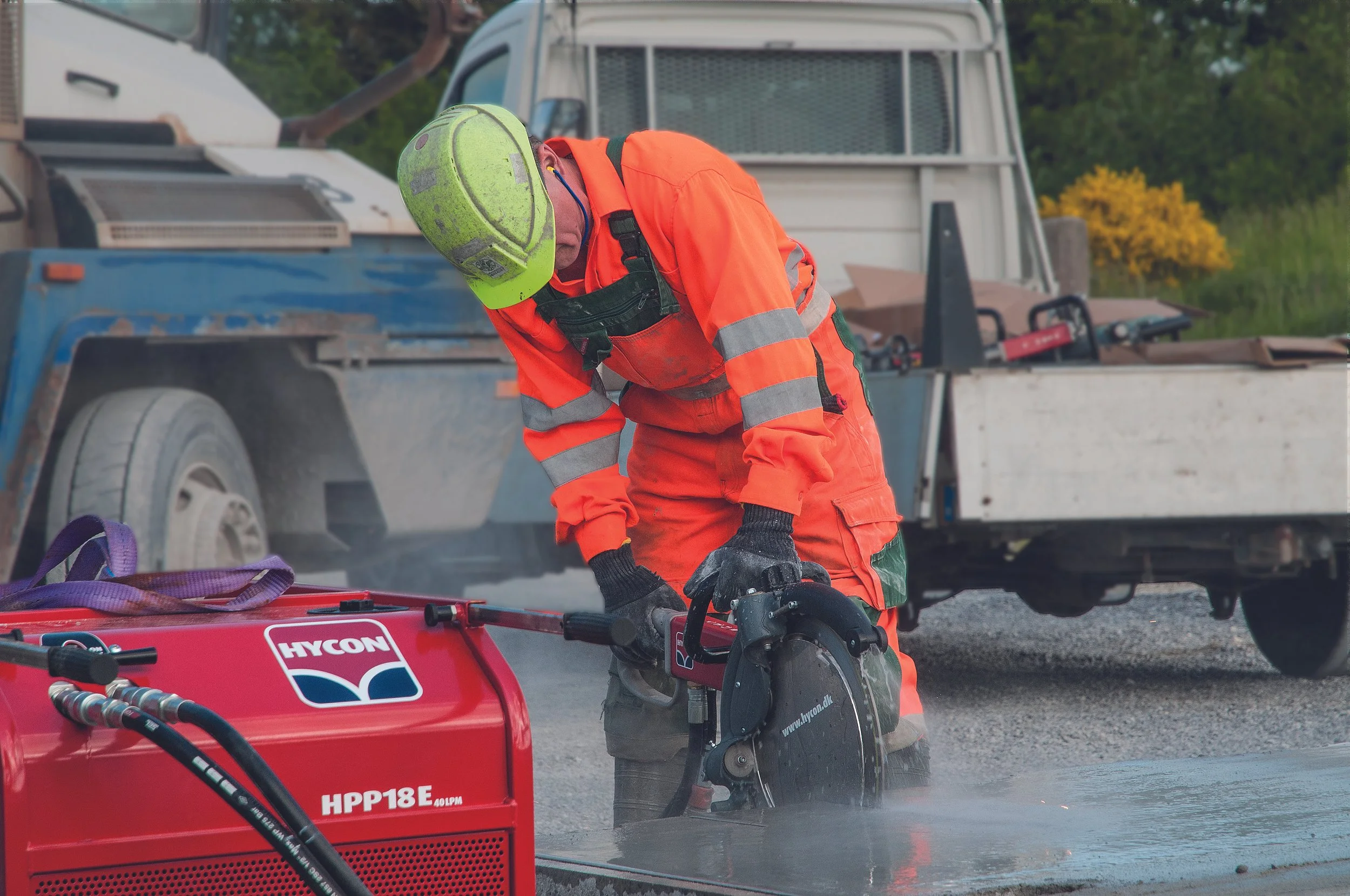 The hydraulic power pack used in the HYCON system produces a sound power level of approximately 109 dB, compared to approximately 115 dB typical of petrol-powered cut-off saw engines.